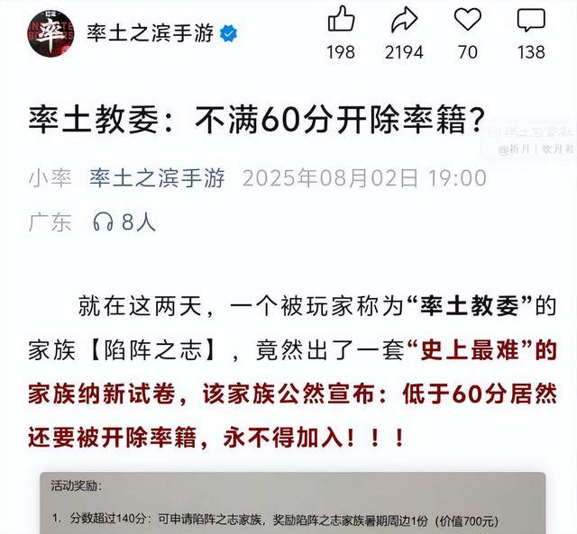 与其他游戏的家族一样,率土的“陷阵之志”家族平常也会水群活跃气氛,而其族长的一大乐趣就是出趣味测试考考大家,谁承想这一举动反而炸出不少“潜水”成员,不过大多是吐槽族长出的题太老了。